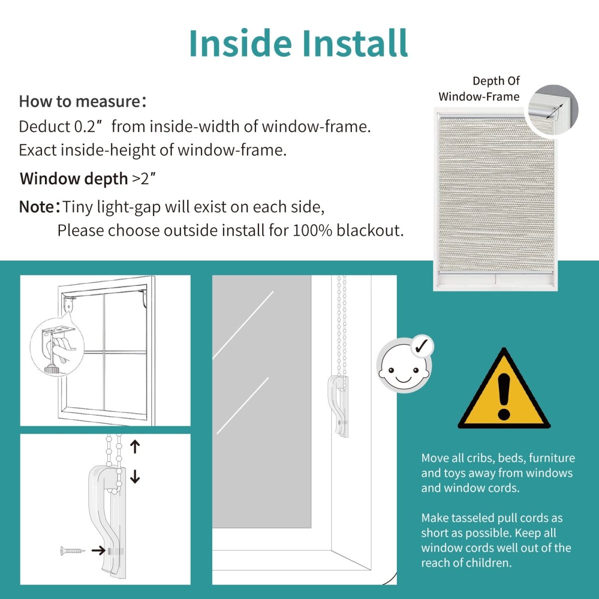 - Measurement Area: Measure from one side of the window frame to the other, adding an additional 2-3 inches on each side (4-6 inches total) to prevent light seepage from the sides.